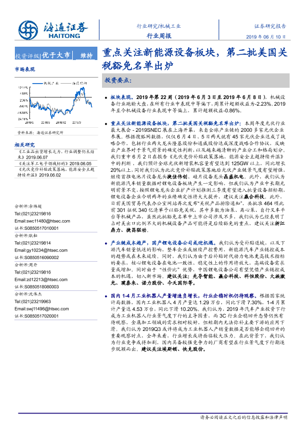 【海通证券】【20190610】20190610-海通证券-机械工业行业周报:重点关注新能源设备板块,第二批美国关税豁免名单出炉-10页
