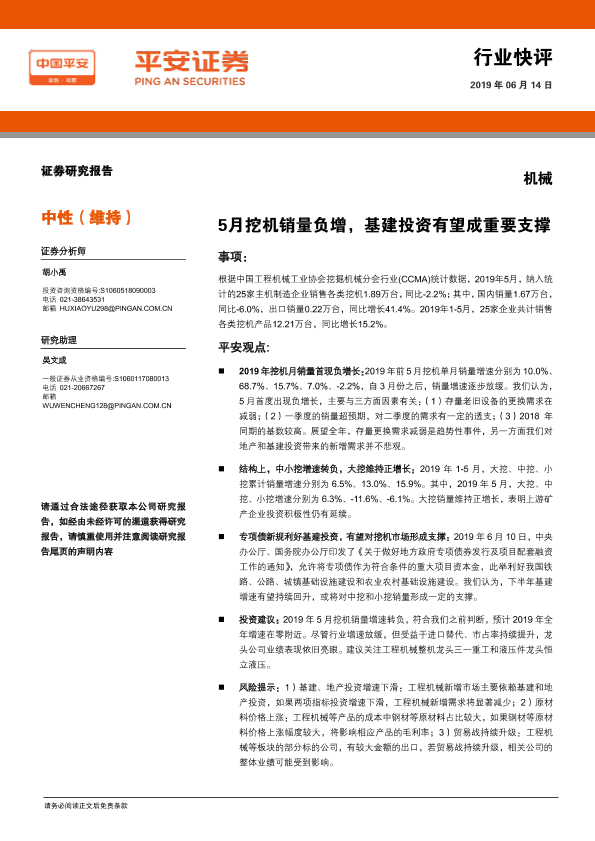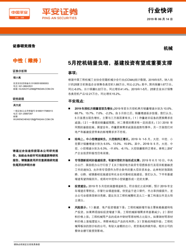 【平安证券】【20190614】机械:5月挖机销量负增,基建投资有望成重要支撑-2页
