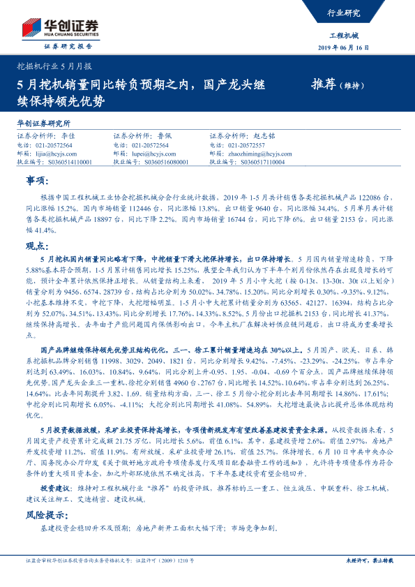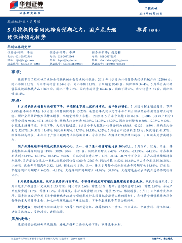 【华创证券】【20190616】20190616-华创证券-挖掘机行业5月月报:5月挖机销量同比转负预期之内,国产龙头继续保持领先优势-11页