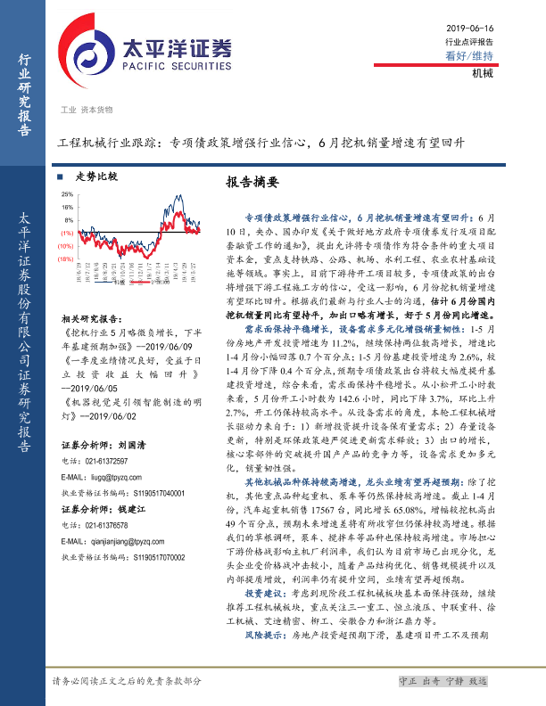 【太平洋证券】【20190616】工程机械行业跟踪:专项债政策增强行业信心,6月挖机销量增速有望回升-5页