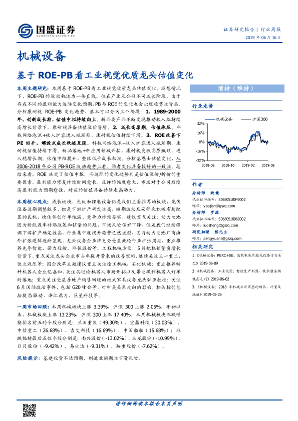 【国盛证券】【20190616】20190616-国盛证券-机械设备行业周报:基于ROE-PB看工业视觉优质龙头估值变化-16页