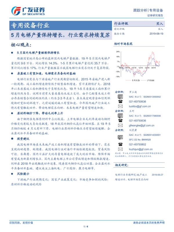 【广发证券】【20190619】专用设备行业:5月电梯产量保持增长,行业需求持续复苏-4页