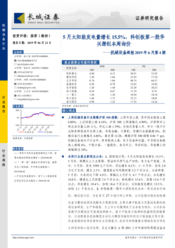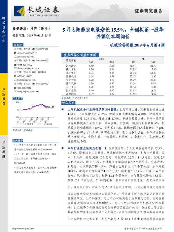 【长城证券】【20190623】20190623-长城证券-机械设备周报2019年6月第4期:5月太阳能发电量增长15.5%,科创板第一股华兴源创本周询价-11页