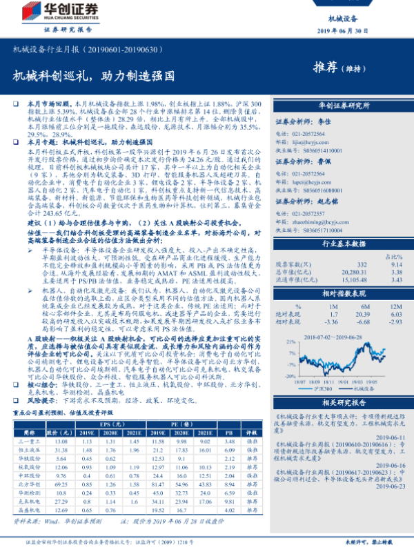 【华创证券】【20190630】20190630-华创证券-机械设备行业月报:机械科创巡礼,助力制造强国-20页