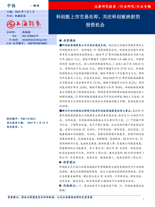 【上海证券】【20190702】机械设备:科创板上市交易在即,关注科创板映射的投资机会-9页