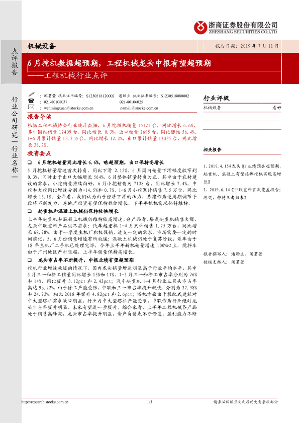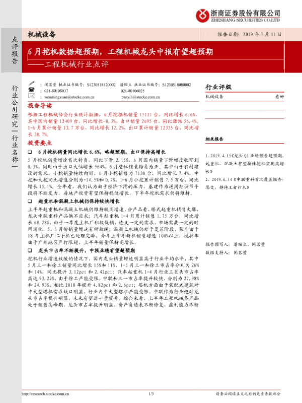 【浙商证券】【20190711】工程机械行业点评:6月挖机数据超预期,工程机械龙头中报有望超预期-3页