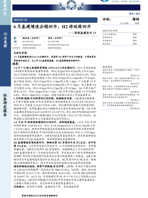 【国泰君安证券】【20190715】20190715-国泰君安-深挖基建系列13:6月基建增速企稳回升,H2将延续回升-4页