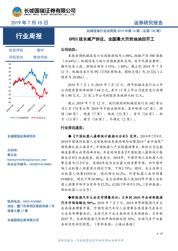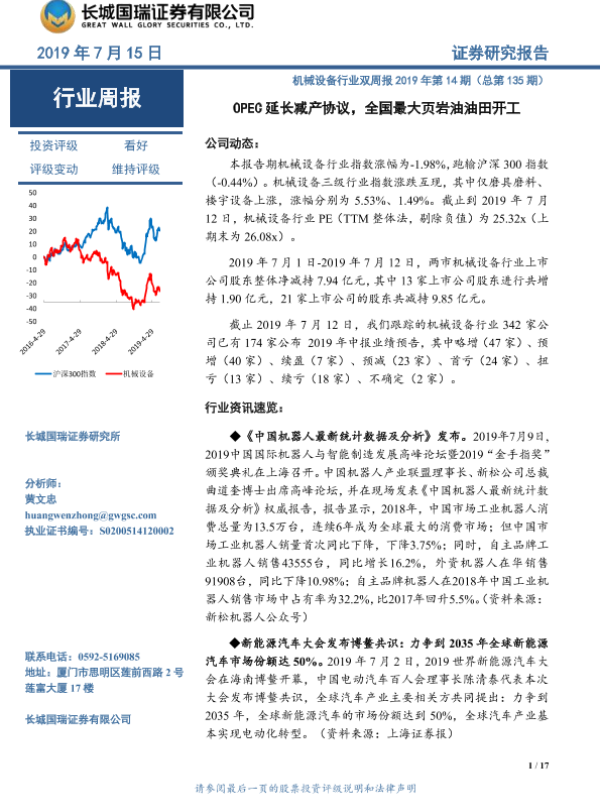 【长城国瑞证券】【20190715】机械设备行业双周报2019年第14期(总第135期):OPEC延长减产协议,全国最大页岩油油田开工-17页