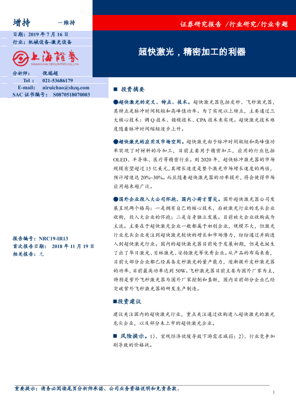 【上海证券】【20190716】超快激光,精密加工的利器-13页
