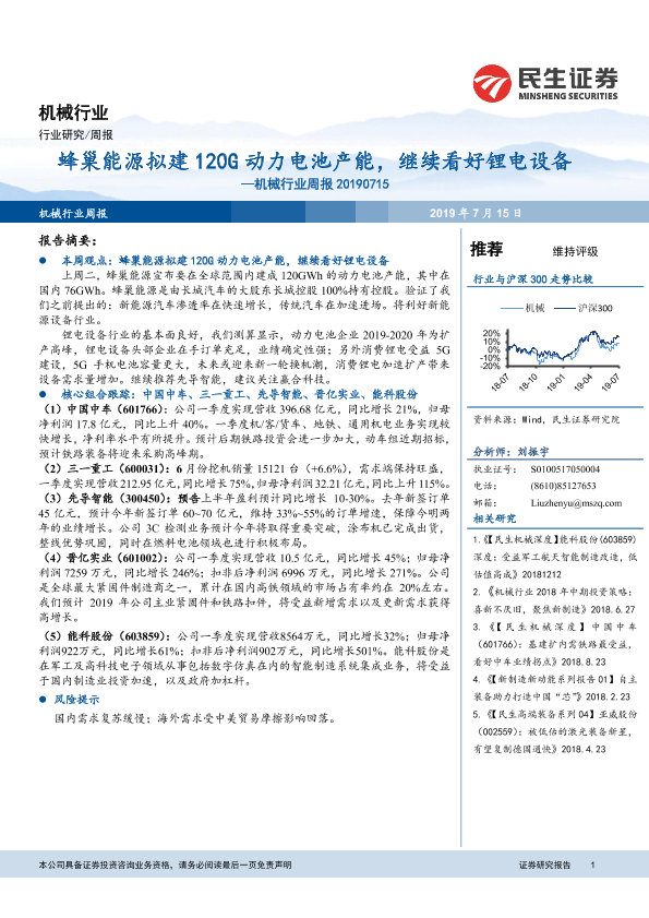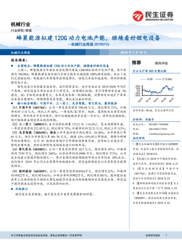 【民生证券】【20190715】机械行业周报:蜂巢能源拟建120G动力电池产能,继续看好锂电设备-18页