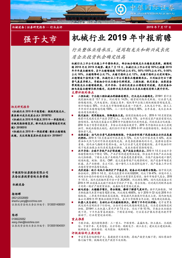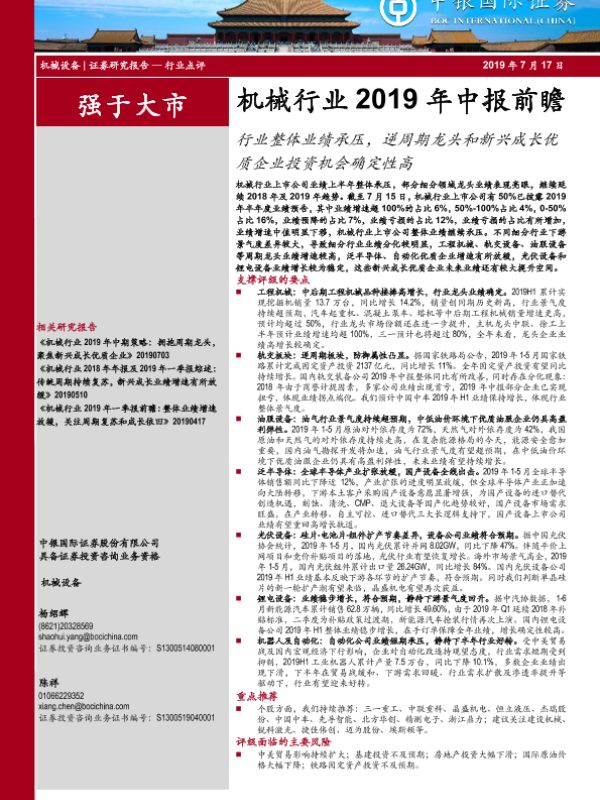 【中银证券】【20190717】机械行业2019年中报前瞻:行业整体业绩承压,逆周期龙头和新兴成长优质企业投资机会确定性高-16页