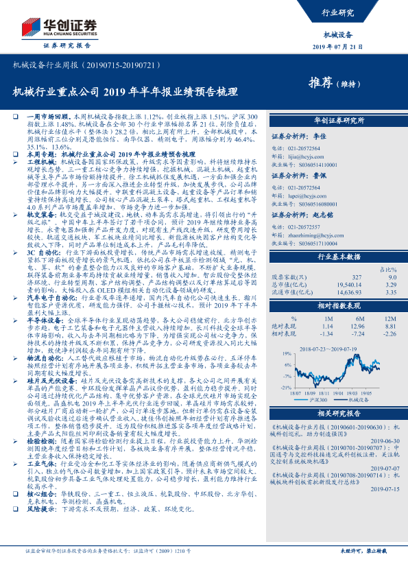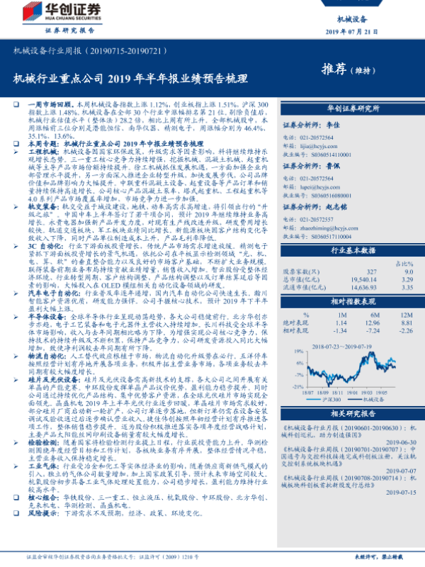 【华创证券】【20190721】机械设备行业周报:机械行业重点公司2019年半年报业绩预告梳理-20页