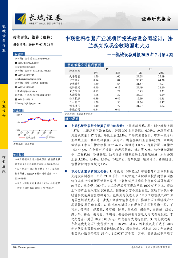 【长城证券】【20190721】20190721-长城证券-机械设备周报2019年7月第4期:中联重科智慧产业城项目投资建设合同签订,法兰泰克拟现金收购国电大力-11页