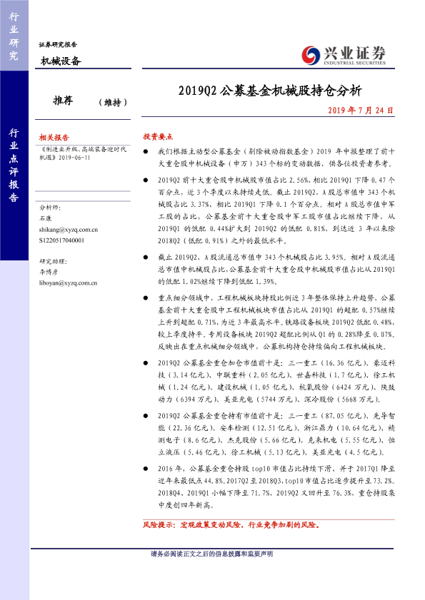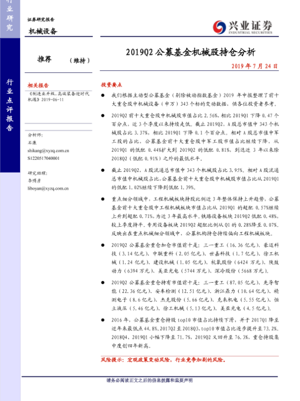 【兴业证券】【20190724】2019Q2公募基金机械股持仓分析-11页