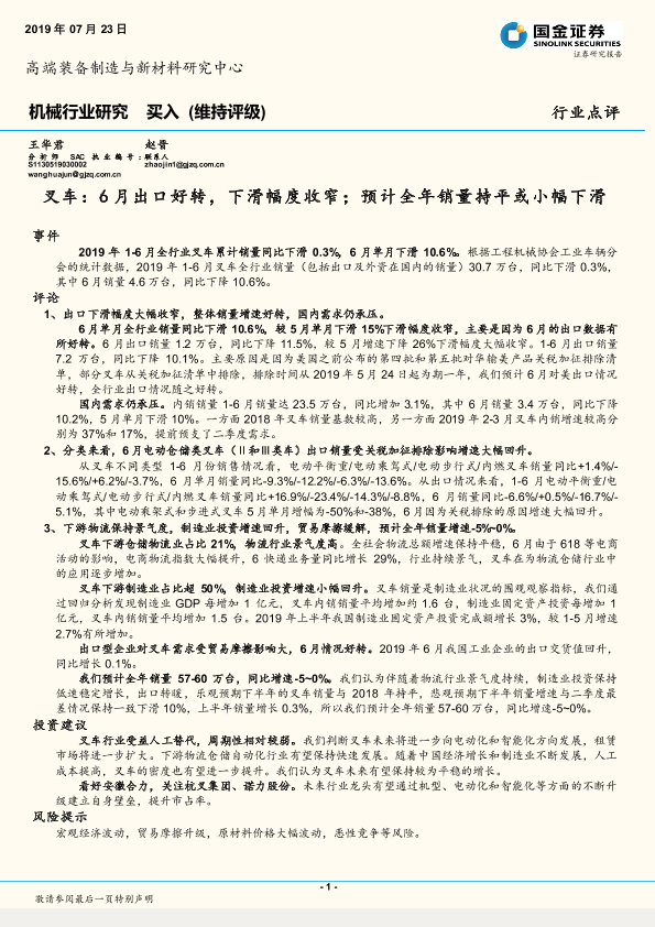 【国金证券】【20190723】机械行业研究:叉车:6月出口好转,下滑幅度收窄;预计全年销量持平或小幅下滑-6页