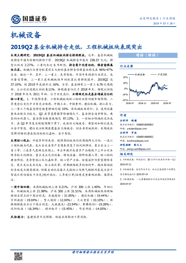 【国盛证券】【20190728】2019Q2基金机械持仓走低,工程机械板块表现突出-14页