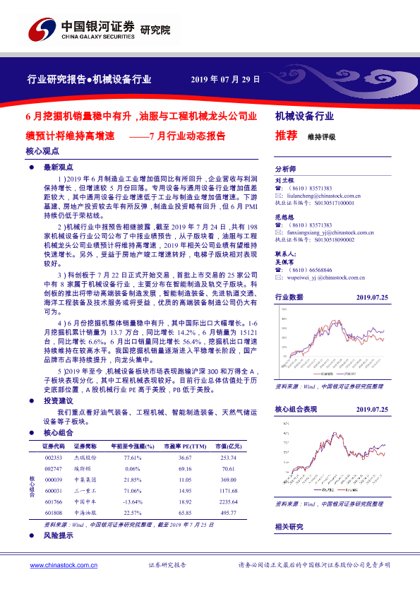【银河证券】【20190729】20190729-中国银河-机械设备7月行业动态报告:6月挖掘机销量稳中有升,油服与工程机械龙头公司业绩预计将维持高增速-39页