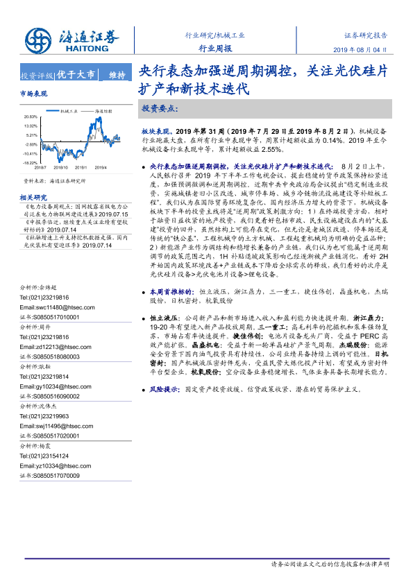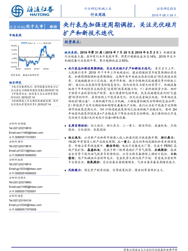 【海通证券】【20190804】20190804-海通证券-机械工业行业周报:央行表态加强逆周期调控,关注光伏硅片扩产和新技术迭代-10页