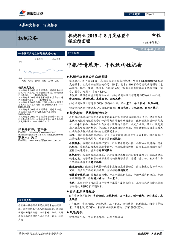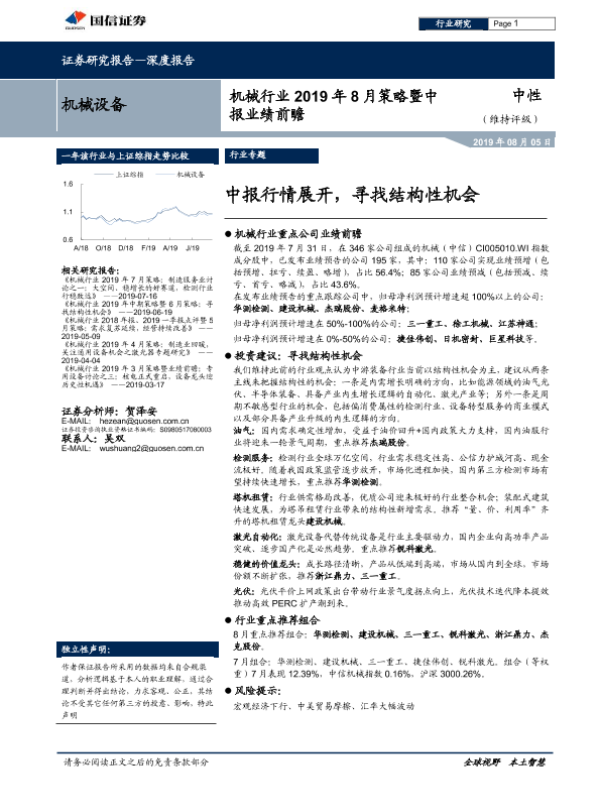 【国信证券】【20190805】机械行业2019年8月策略暨中报业绩前瞻:中报行情展开,寻找结构性机会-15页