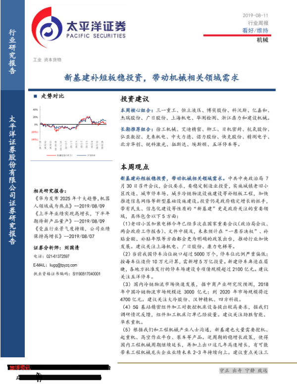 【太平洋证券】【20190811】机械行业周报:新基建补短板稳投资,带动机械相关领域需求-13页