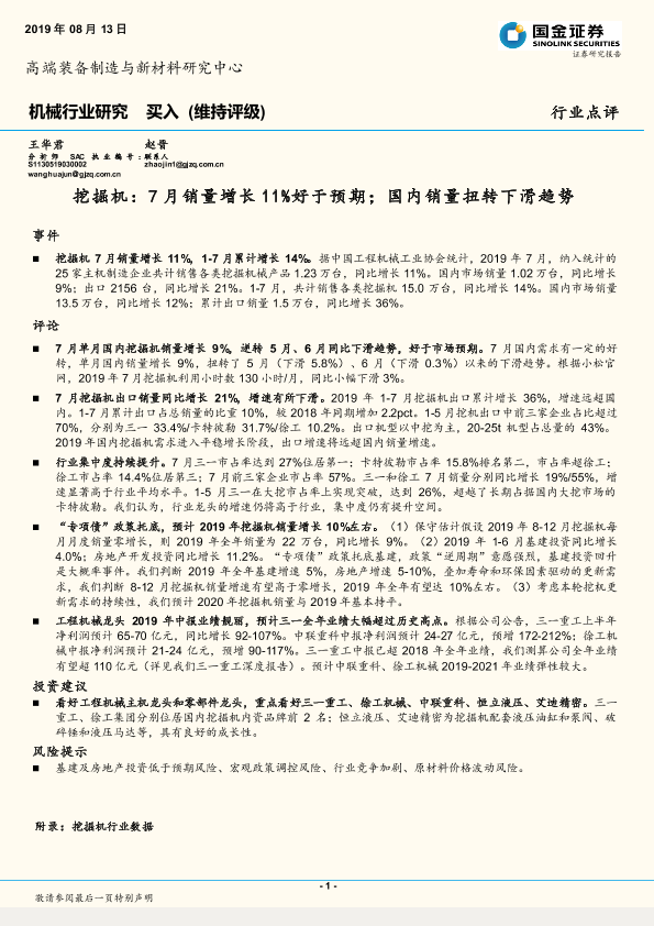 【国金证券】【20190813】机械行业研究:挖掘机:7月销量增长11%好于预期,国内销量扭转下滑趋势-5页