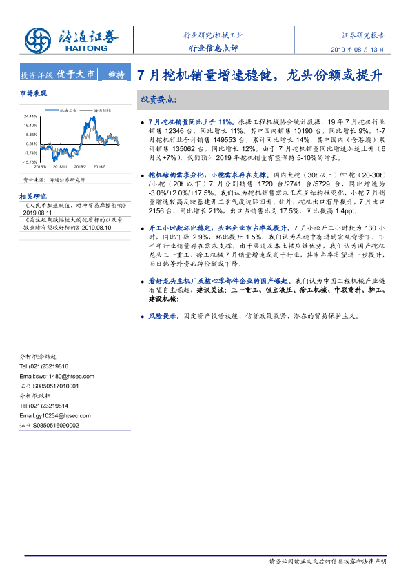 【海通证券】【20190813】机械工业行业信息点评:7月挖机销量增速稳健,龙头份额或提升-4页