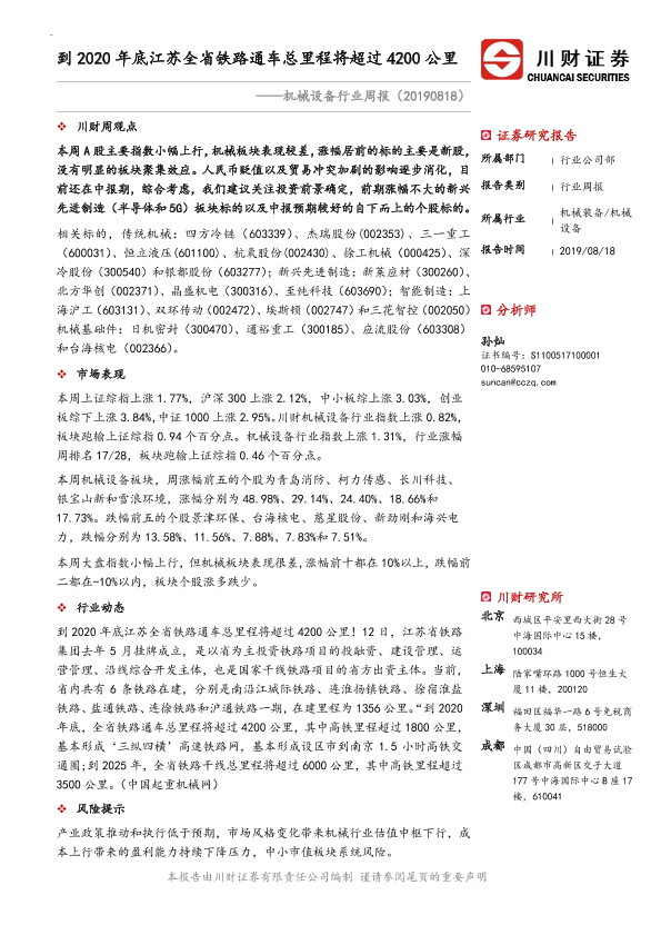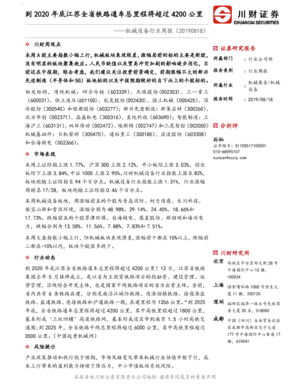 【川财证券】【20190818】机械设备行业周报:到2020年底江苏全省铁路通车总里程将超过4200公里-9页