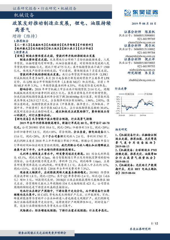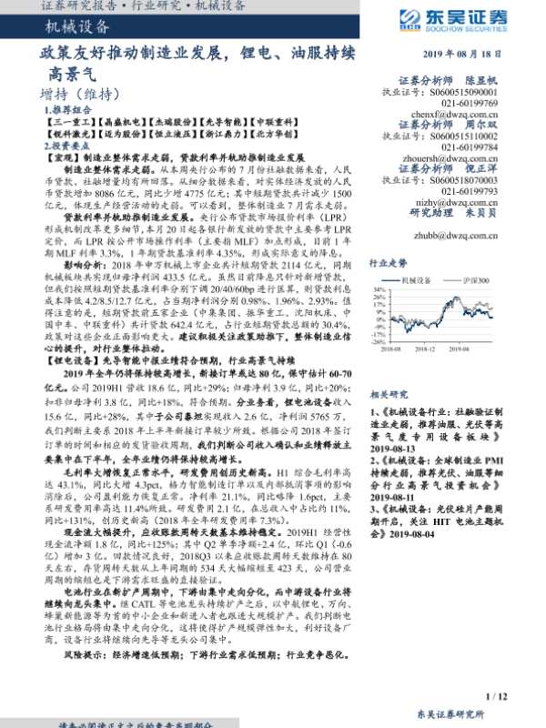 【东吴证券】【20190818】政策友好推动制造业发展,锂电、油服持续高景气-12页
