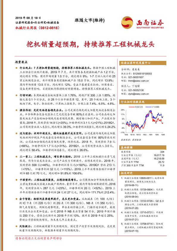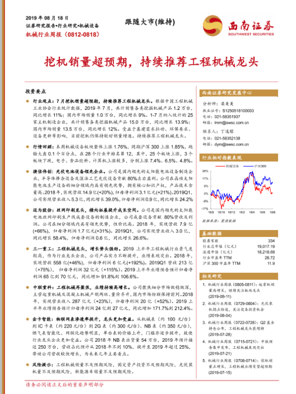 【西南证券】【20190818】机械行业周报:挖机销量超预期,持续推荐工程机械龙头-8页