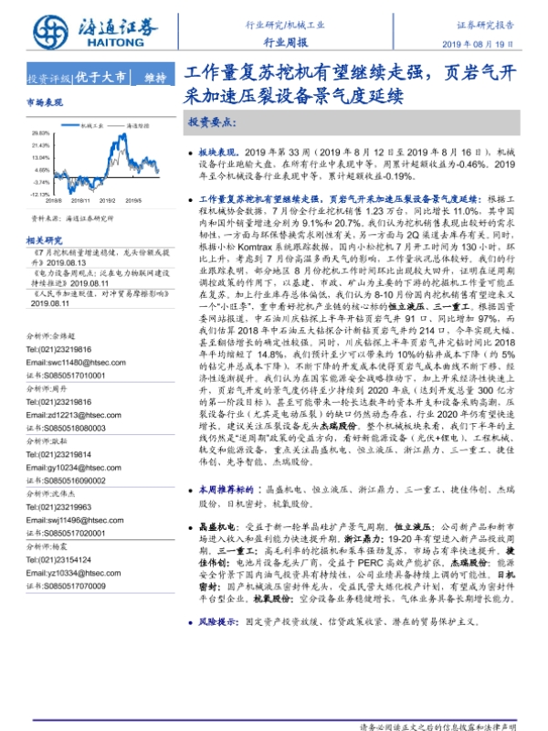 【海通证券】【20190819】20190819-海通证券-机械工业行业周报:工作量复苏挖机有望继续走强,页岩气开采加速压裂设备景气度延续-10页