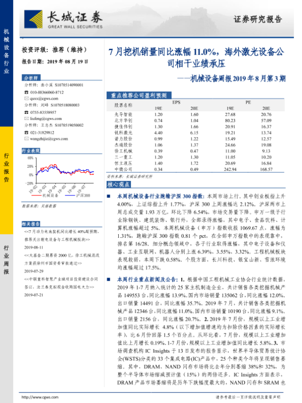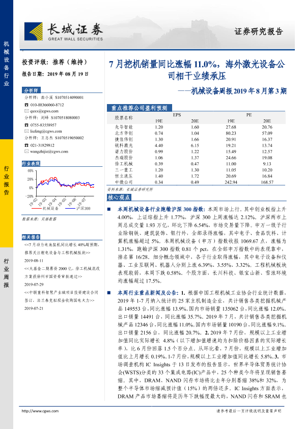 【长城证券】【20190819】机械设备周报2019年8月第3期:7月挖机销量同比涨幅11.0%,海外激光设备公司相干业绩承压-11页