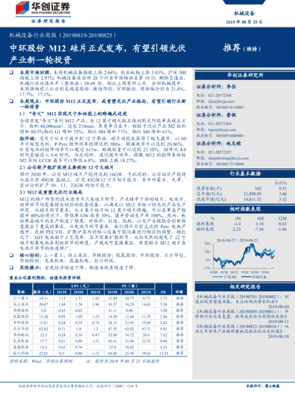 【华创证券】【20190825】机械设备行业周报:中环股份M12硅片正式发布,有望引领光伏产业新一轮投资-22页