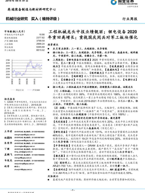 【国金证券】【20190901】20190901-国金证券-机械行业研究周报:工程机械龙头中报业绩靓丽;锂电设备2020年重回高增长;重视国庆阅兵对军工板块催化-23页