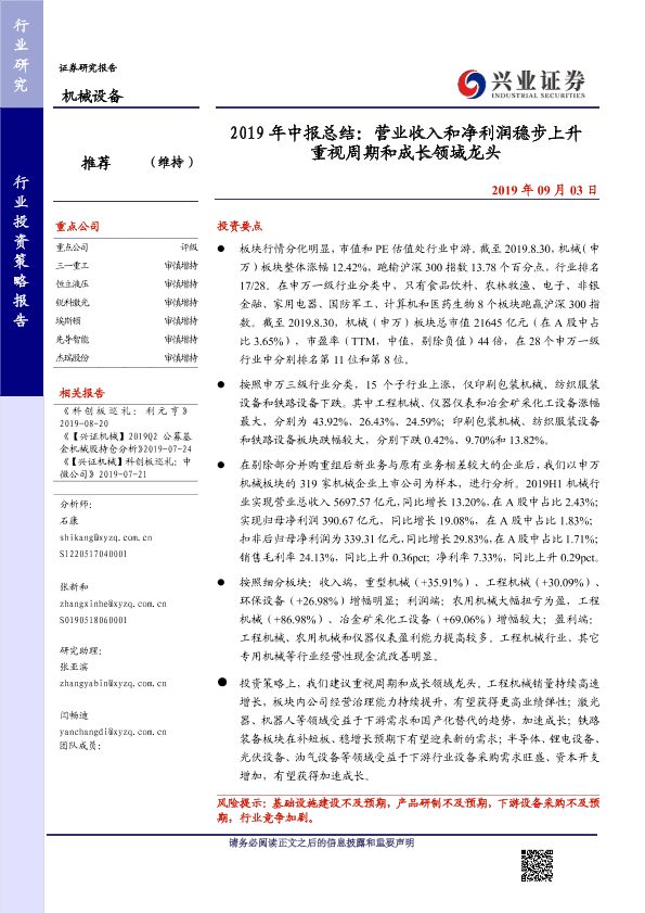 【兴业证券】【20190903】2019年中报总结:营业收入和净利润稳步上升 重视周期和成长领域龙头-40页
