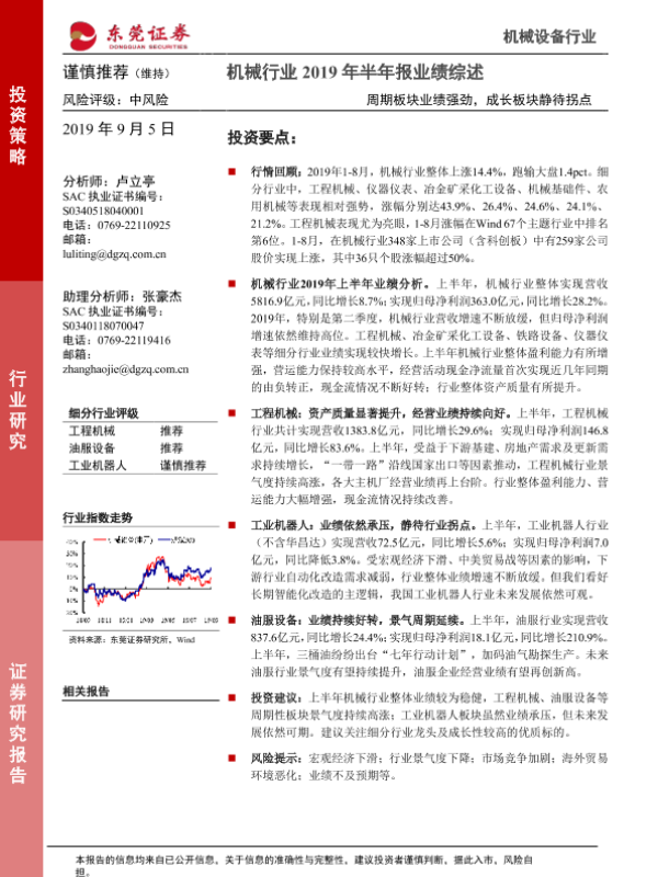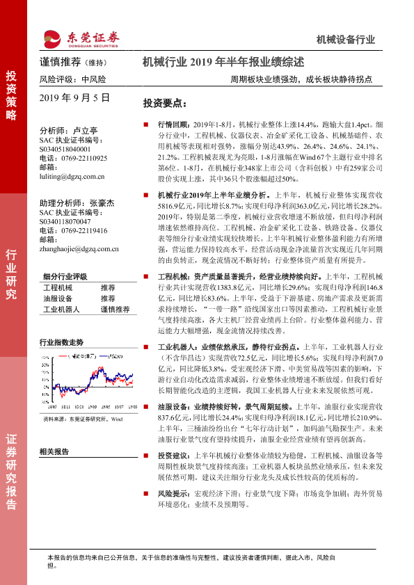 【东莞证券】【20190905】机械行业2019年半年报业绩综述:周期板块业绩强劲,成长板块静待拐点-18页