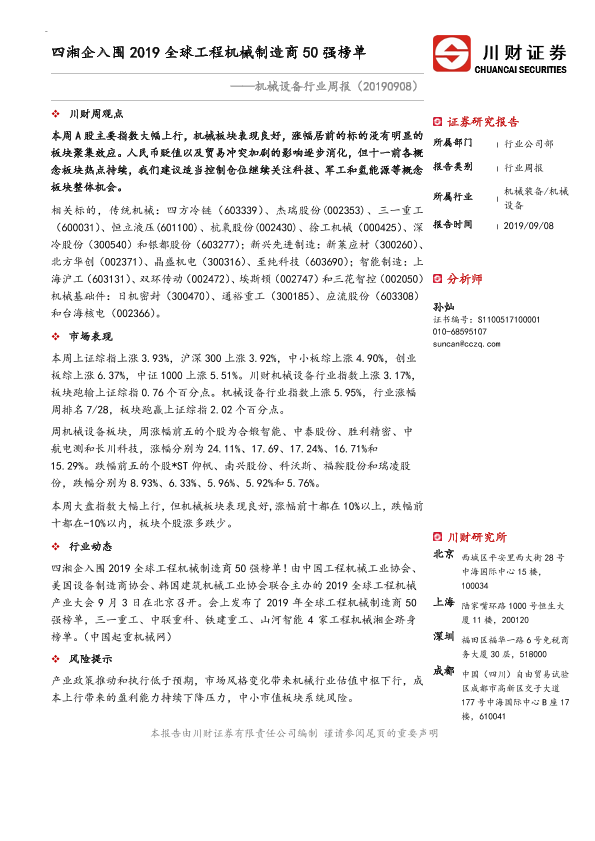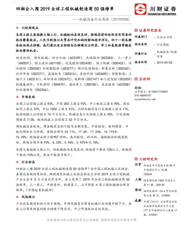 【川财证券】【20190908】机械设备行业周报:四湘企入围2019全球工程机械制造商50强榜单-9页