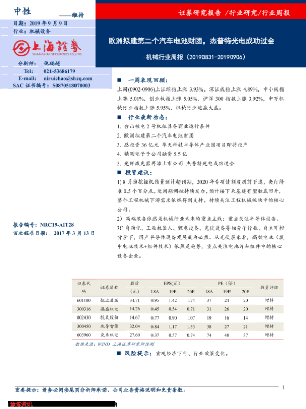 【上海证券】【20190909】20190909-上海证券-机械行业周报:欧洲拟建第二个汽车电池财团,杰普特光电成功过会-5页
