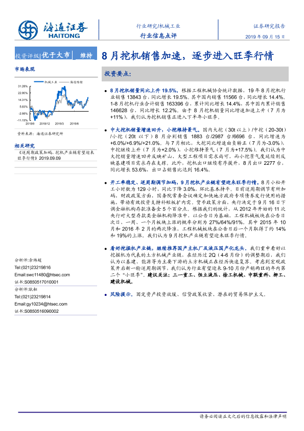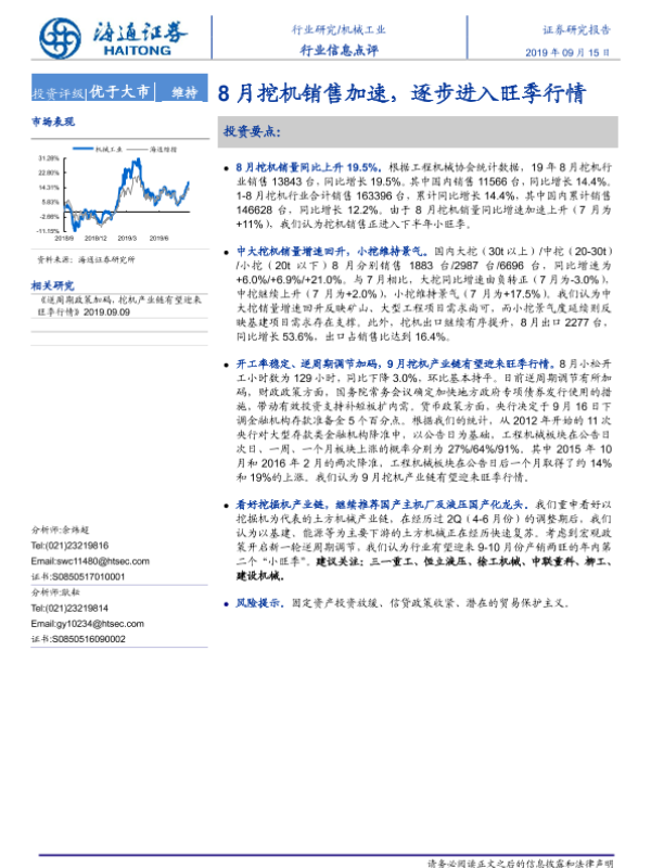 【海通证券】【20190915】机械工业行业信息点评:8月挖机销售加速,逐步进入旺季行情-4页