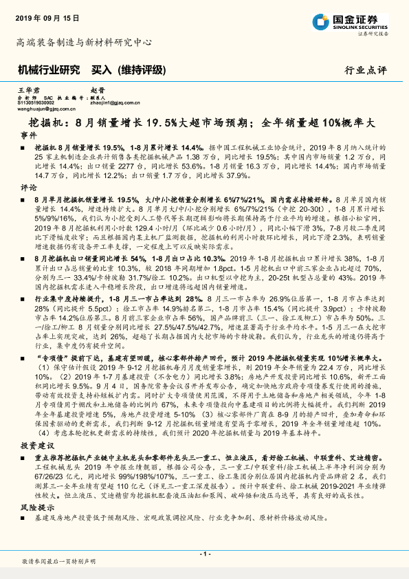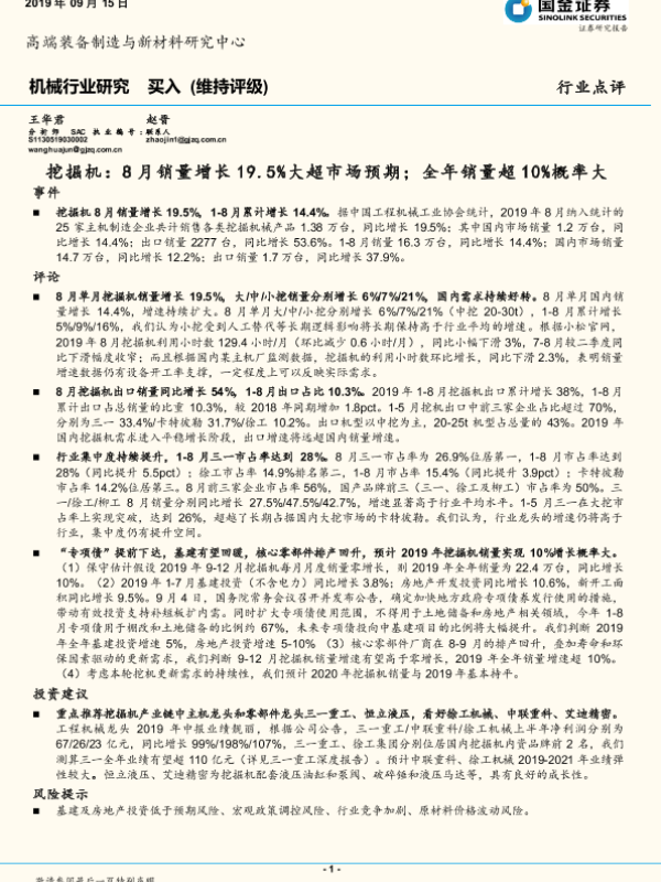 【国金证券】【20190915】20190915-国金证券-机械行业研究:挖掘机:8月销量增长19.5%大超市场预期;全年销量超10%概率大-5页