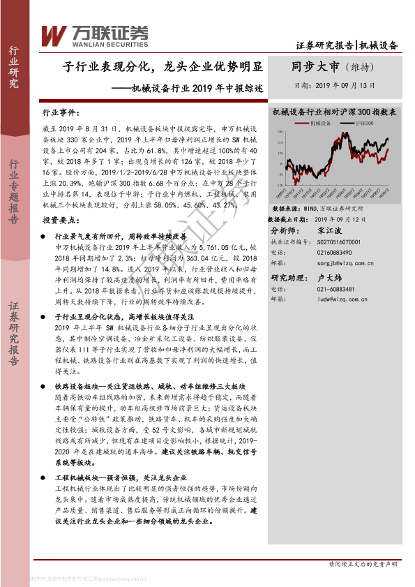 【万联证券】【20190913】机械设备行业2019年中报综述:子行业表现分化,龙头企业优势明显-21页