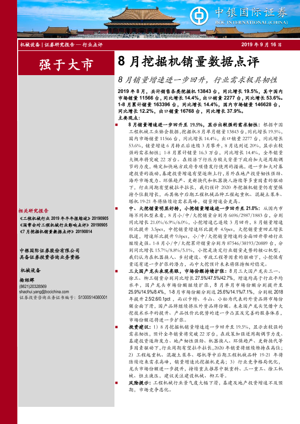 【中银证券】【20190916】8月挖掘机销量数据点评:8月销量增速进一步回升,行业需求极具韧性-5页