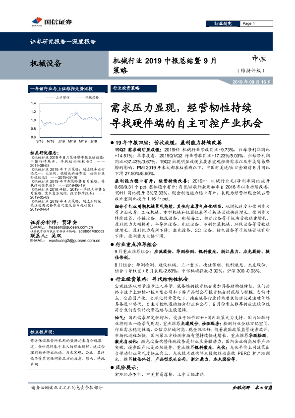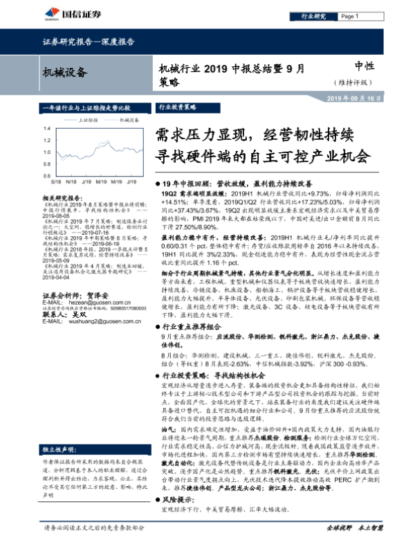 【国信证券】【20190916】机械行业2019中报总结暨9月策略:需求压力显现,经营韧性持续寻找硬件端的自主可控产业机会-20页