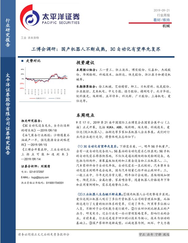【太平洋证券】【20190921】20190921-太平洋-机械行业周报:工博会调研:国产机器人不断成熟,3C自动化有望率先复苏-13页
