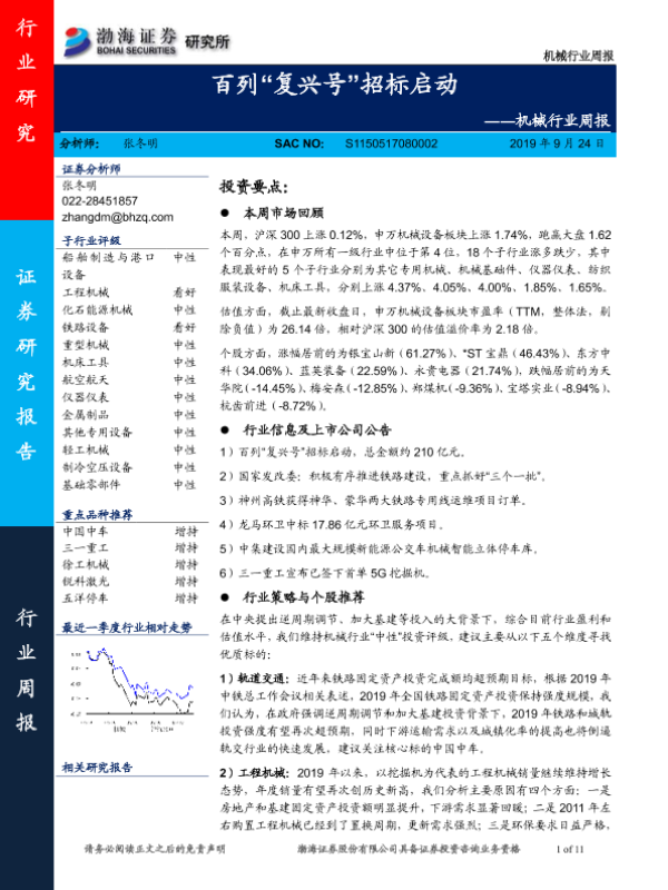【渤海证券】【20190924】机械行业周报:百列“复兴号”招标启动-11页