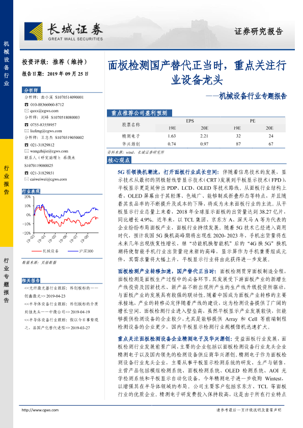 【长城证券】【20190925】20190925-长城证券-机械设备行业专题报告:面板检测国产替代正当时,重点关注行业设备龙头-22页