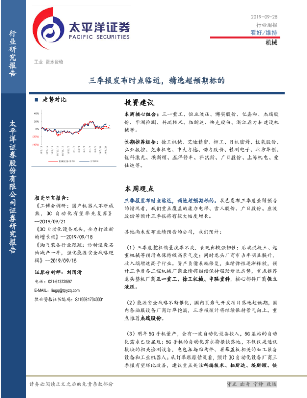 【太平洋证券】【20190928】20190928-太平洋-机械行业周报:三季报发布时点临近,精选超预期标的-14页