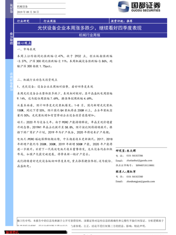 【国都证券】【20190930】20190930-国都证券-机械行业周报:光伏设备企业本周涨多跌少,继续看好四季度表现-3页