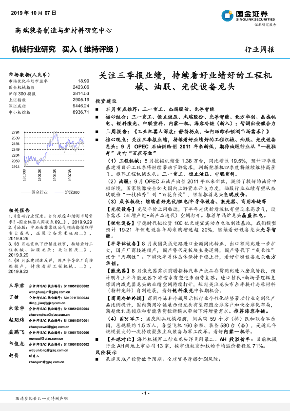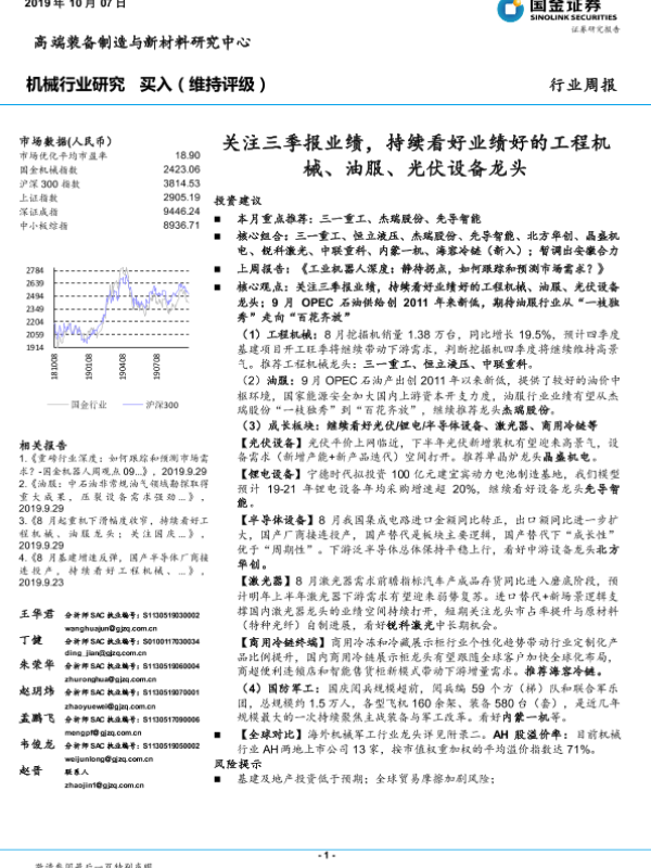 【国金证券】【20191007】20191007-国金证券-机械行业研究:关注三季报业绩,持续看好业绩好的工程机械、油服、光伏设备龙头-22页