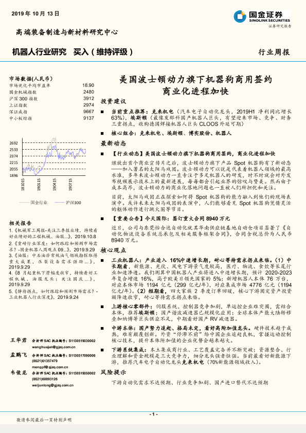 【国金证券】【20191013】20191013-国金证券-机器人行业研究周报:美国波士顿动力旗下机器狗商用签约 商业化进程加快-12页