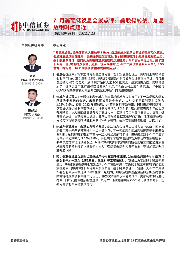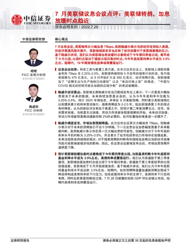 【中信证券】【20220728】7月美联储议息会议点评:美联储转鸽,加息放缓时点趋近-36页